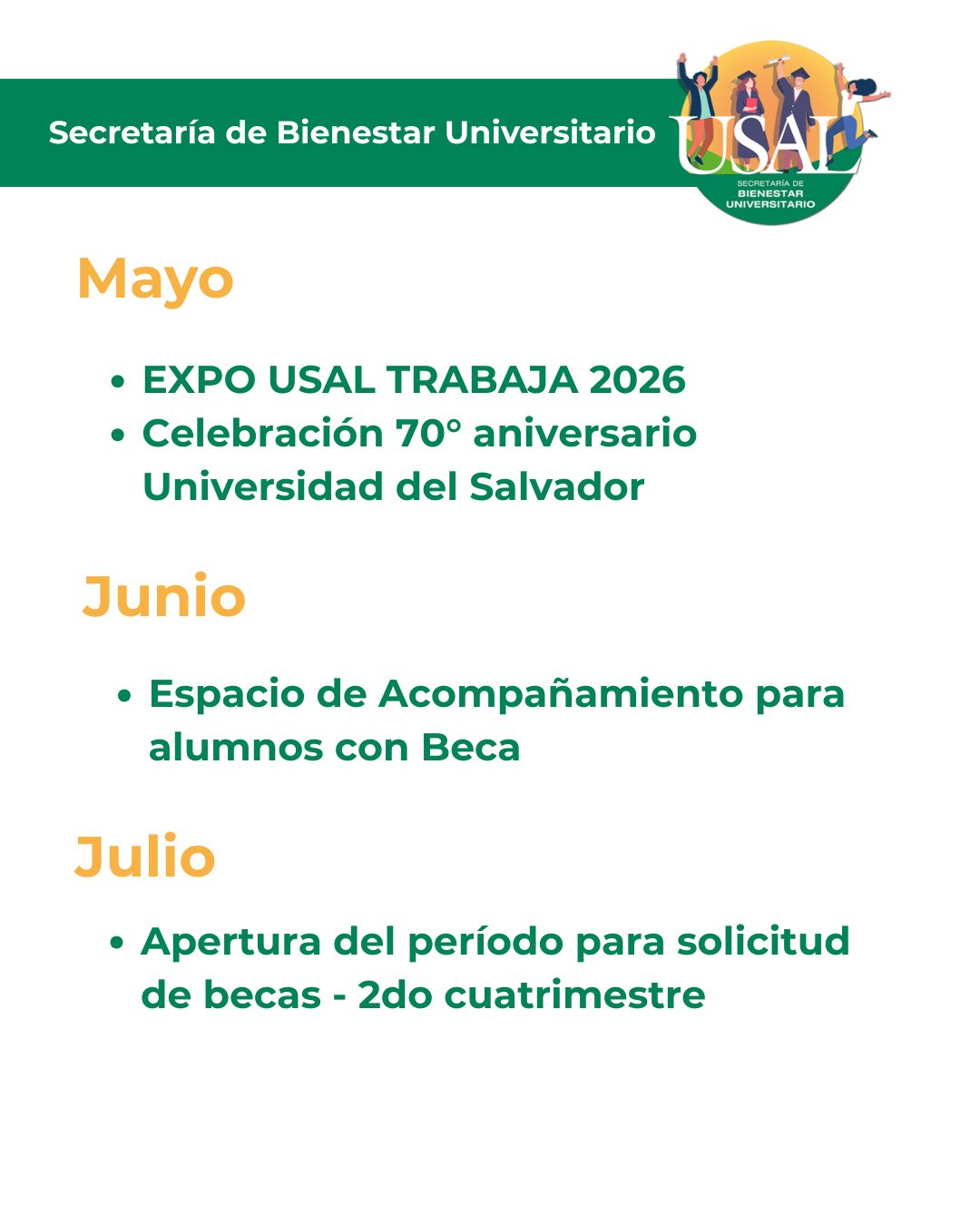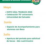 La Secretaría de Bienestar Universitario de la Universidad del Salvador (USAL) ha dado a conocer su Agenda Semestral 2026. Este cronograma detallado reúne las actividades, becas y eventos destacados diseñados para acompañar a alumnos y graduados durante la primera mitad del año académico.