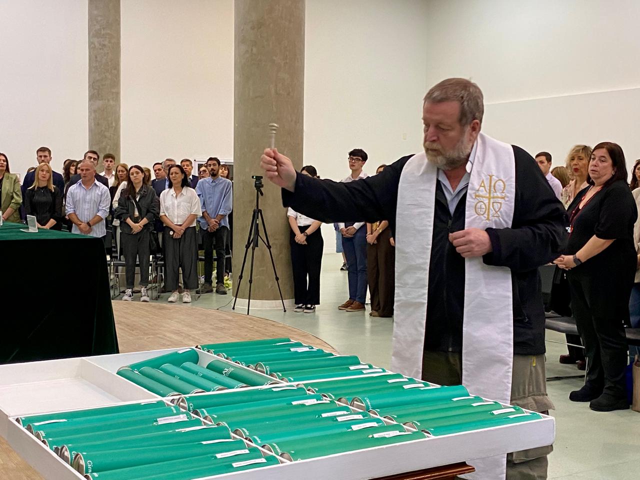 El padre Gabriel Tomás realizó la bendición de los diplomas. A continuación, en nombre suyo y de los graduados que fueron distinguidos, Matías Valentín Miller, graduado de la Licenciatura en Filosofía de la Facultad de Filosofía, Historia, Letras y Estudios Orientales, dirigió unas palabras señalando que: “La formación universitaria es, por un lado, un desafío intelectual, una reformulación de creencias previas en conocimientos sistematizados, pero simultáneamente, se trata de un proceso de concientización respecto a la finalidad práctica de nuestra formación: la mejora del bienestar humano”.