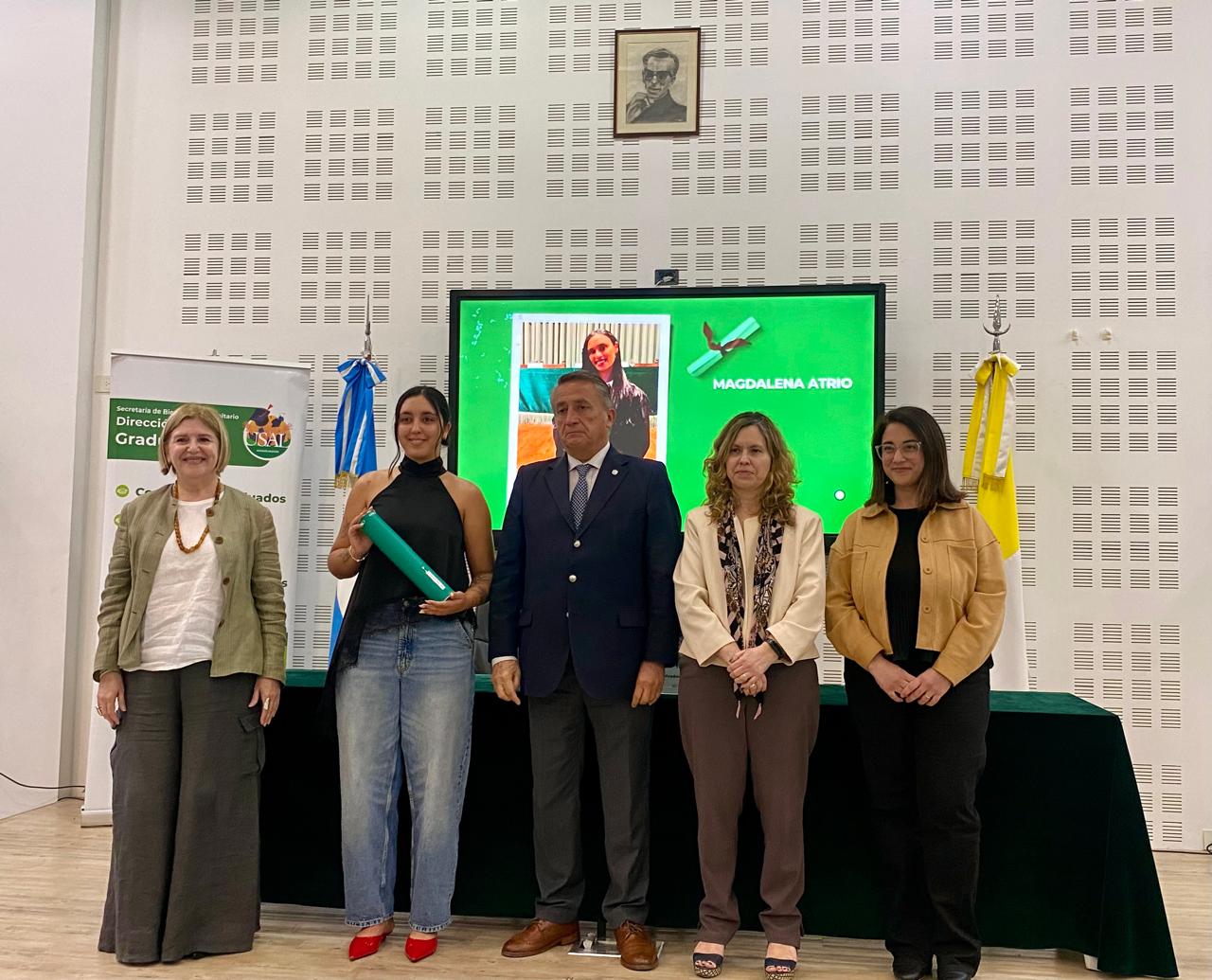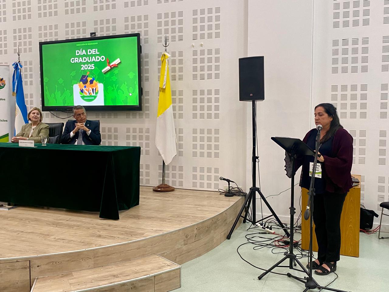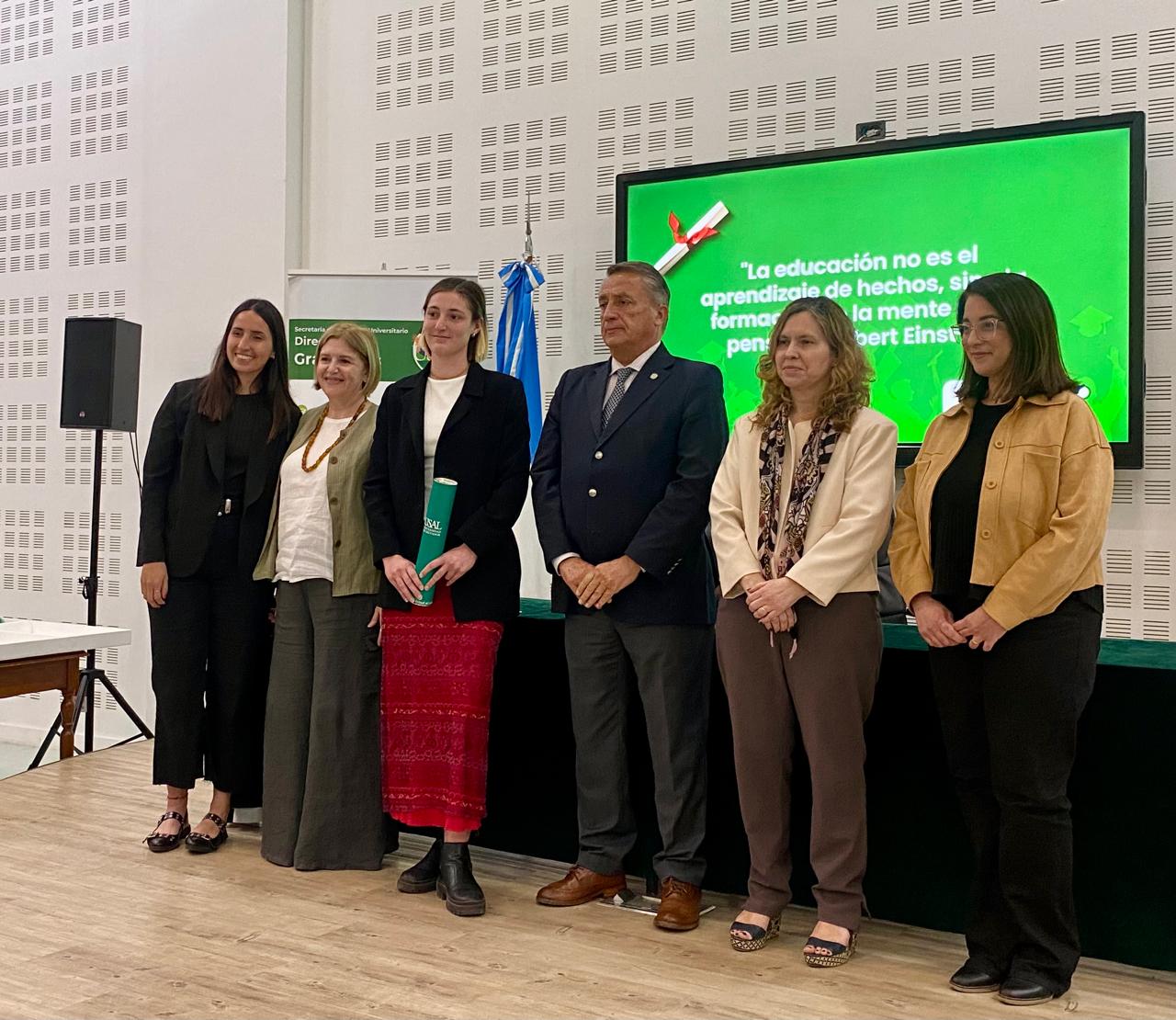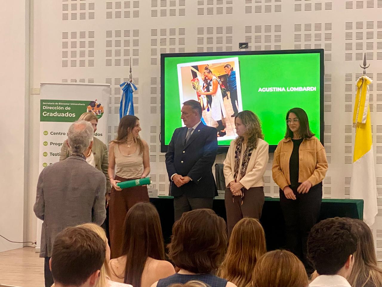 Seguidamente, en nombre de la Comunidad Académica, la Lic. Agustina Lucero Schmidt, Secretaria de la Secretaría de Bienestar Universitario, remarcó que: “Celebrar a quienes hoy reciben esta distinción no es solo reconocer lo que lograron, sino también valorar cómo lo hicieron.