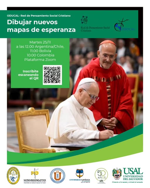 El Vicerrectorado de Formación (VRF) de la Universidad del Salvador (USAL), invita a su comunidad académica y al público en general a participar del Conversatorio: “Dibujar nuevos mapas de esperanza” organizado por la Red de Pensamiento Social Cristiano de ODUCAL (Organización de Universidades Católicas de América Latina y el Caribe), de la cual USAL es una Institución activa y colaboradora.