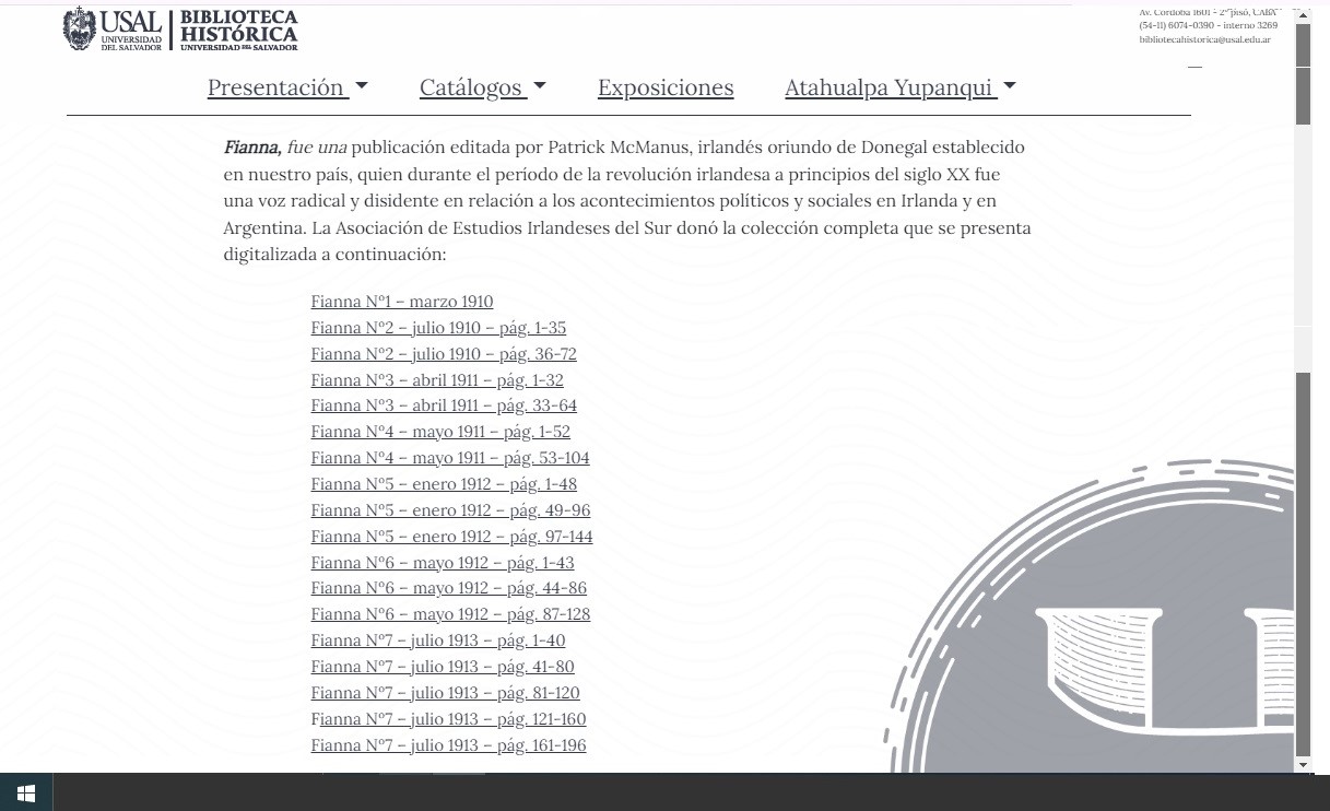 Desde AEIS, con el doble propósito de contribuir al acervo de la Biblioteca Histórica de la USAL, y de preservar y hacer público este legado de los irlandeses en la Argentina, se propuso la realización del proyecto de digitalización del periódico Fianna, que la Asociación de Estudios Irlandeses del Sur entregó a la Universidad del Salvador, con el fin de conservar el material y hacer accesible públicamente su contenido para los investigadores e interesados en la diáspora irlandesa en nuestro país.