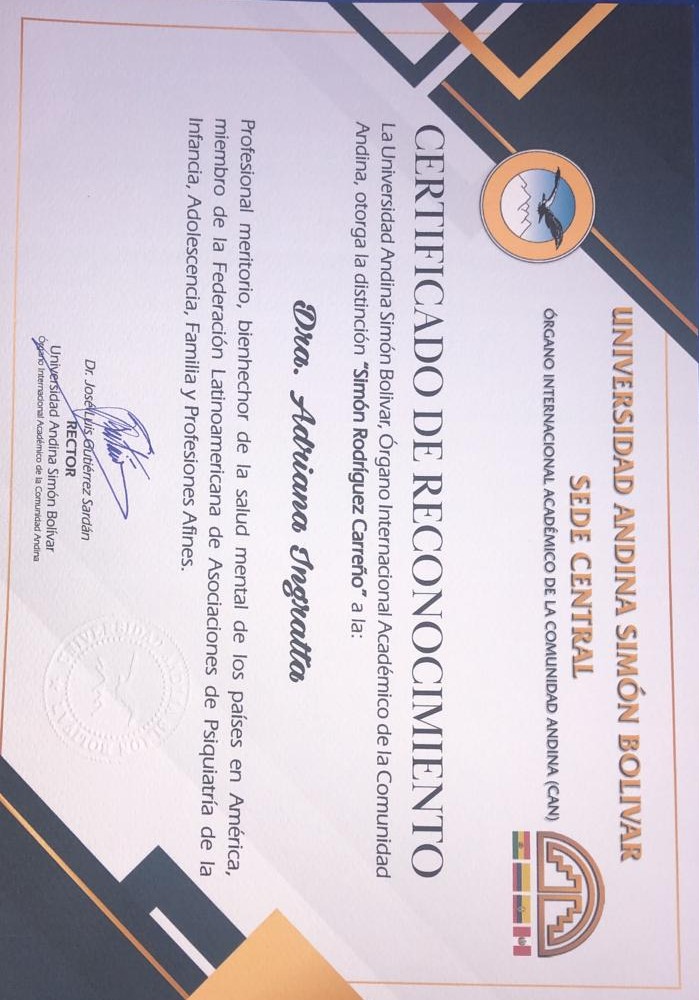 La Dra. Adriana Virginia Ingratta, profesora de la Facultad de Medicina de nuestra Casa de Estudios, recibió la distinción “Simón Rodríguez Carreño” como profesional meritorio, bienhechor de la salud mental de los países en América en el marco del “XXV Congreso FLAPIA” (Federación Latinoamericana de Psiquiatría Infanto Juvenil y profesiones afines), realizado en Sucre, Bolivia, del 10 al 12 de septiembre. Asimismo, otros profesionales de Latinoamérica fueron distinguidos por sus méritos a lo largo de su trayectoria en el campo de la salud mental de las infancias y adolescencias.