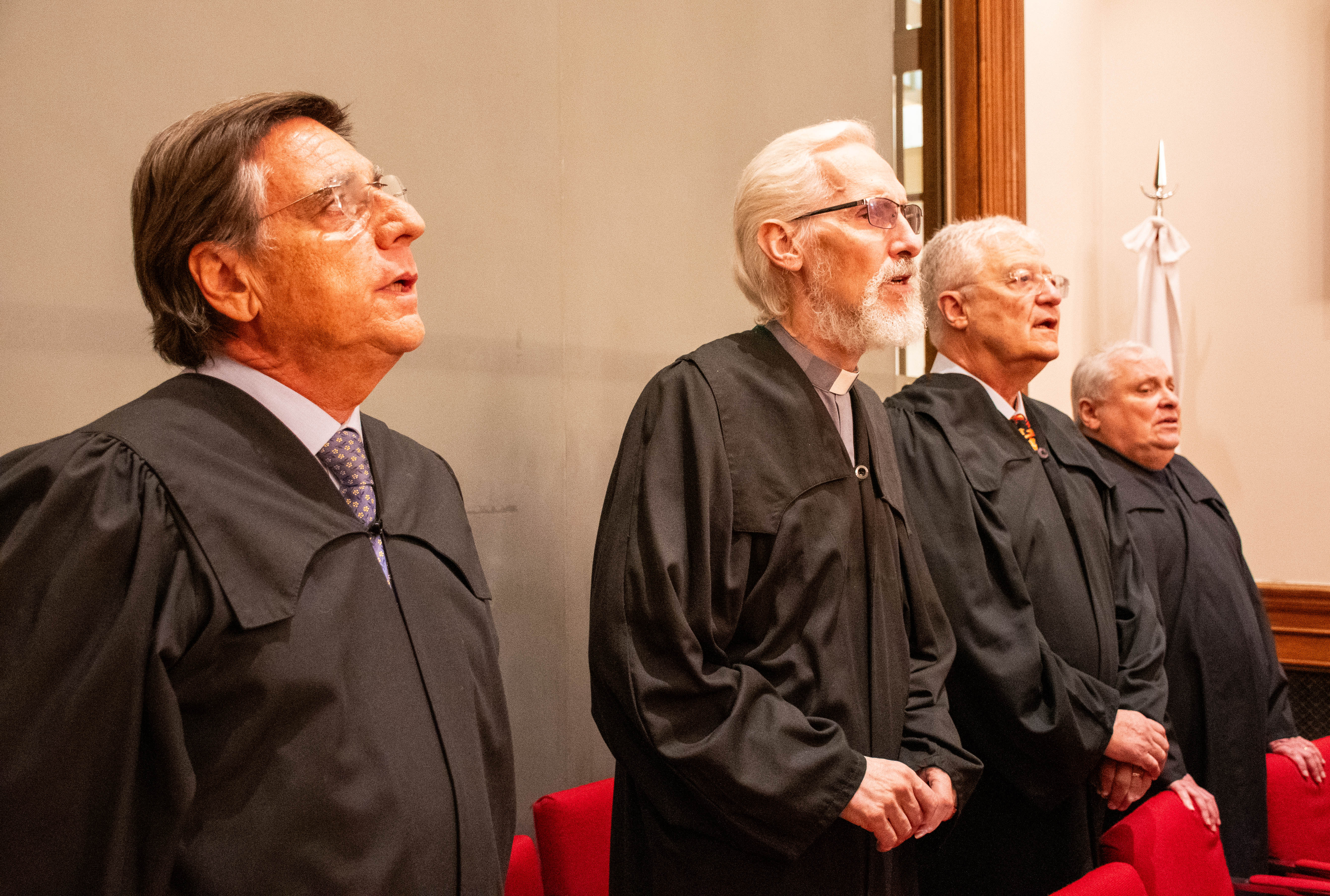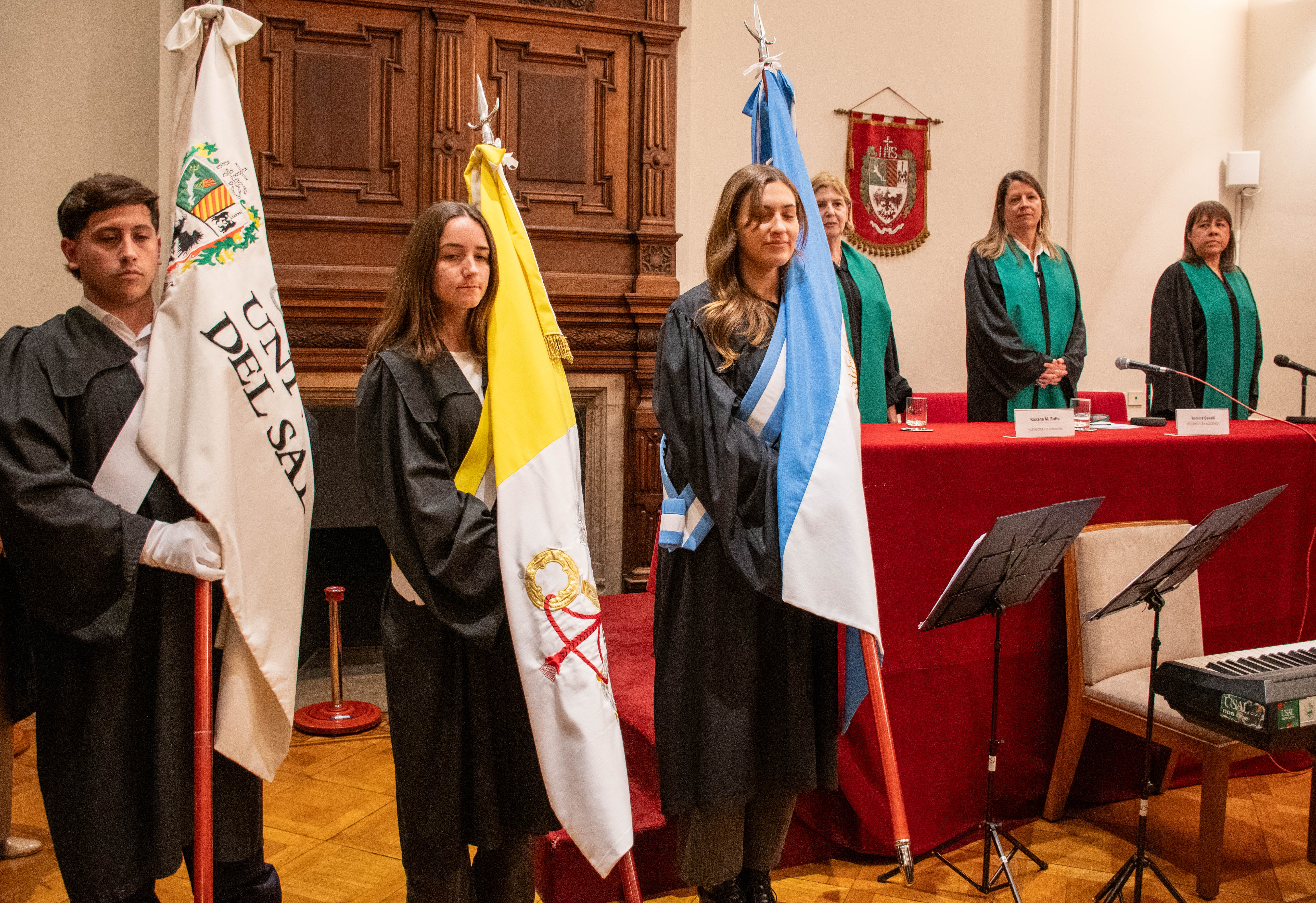 Dio comienzo a la celebración el ingreso de las banderas de ceremonia. Portó la bandera Argentina la alumna Annaliese Brandauer, de la carrera de Filosofía de la Facultad de Filosofía, Historia, Letras y Estudios Orientales. Portó la bandera Papal la estudiante de la carrera de Medicina de la Facultad de Medicina, Camila Fraguas y la Bandera de la Universidad del Salvador el alumno Guido Carnevale, de la carrera de Arquitectura de la Facultad de Arte y Arquitectura. A continuación, se entonaron las estrofas del Himno Nacional Argentino.