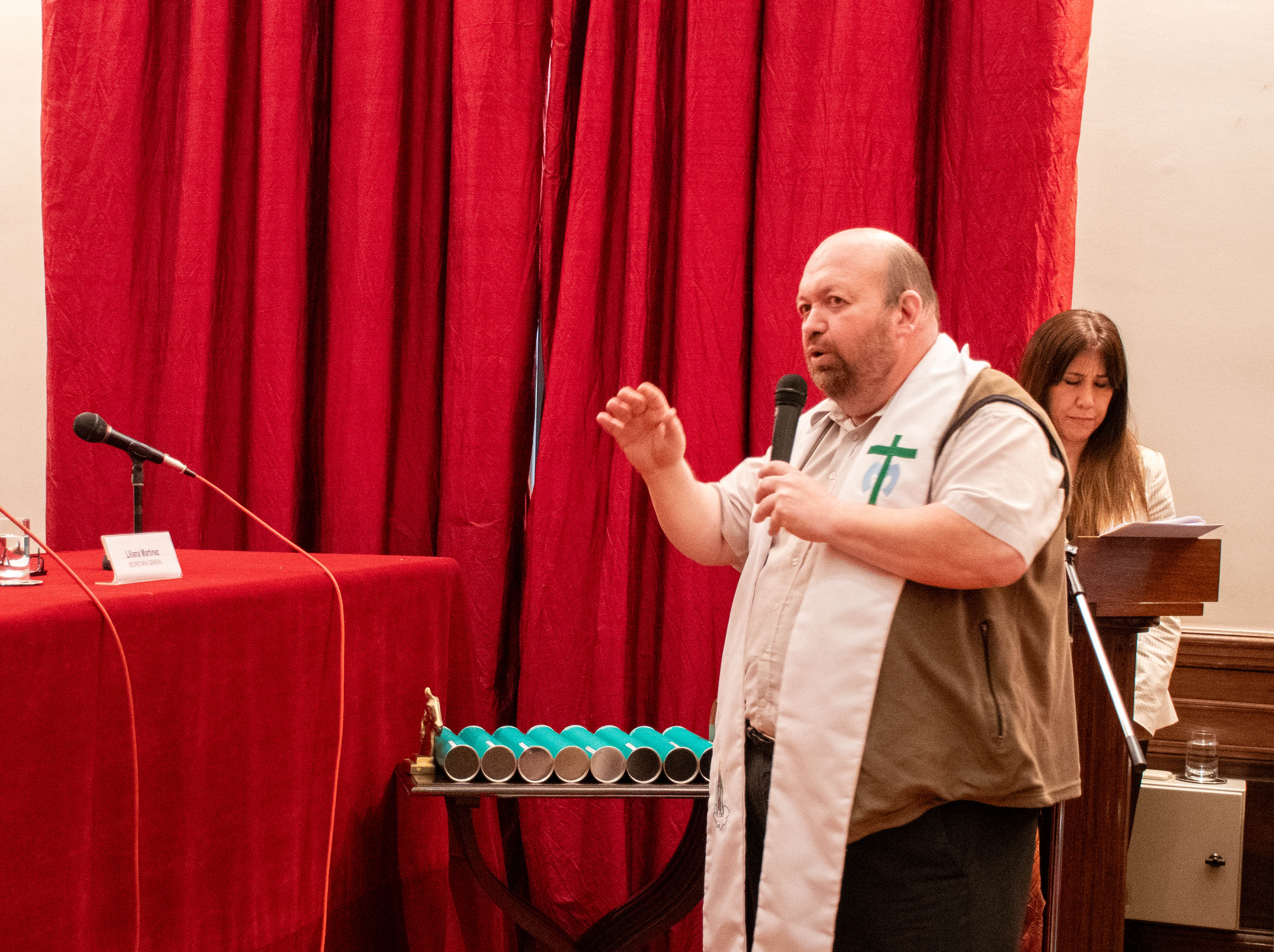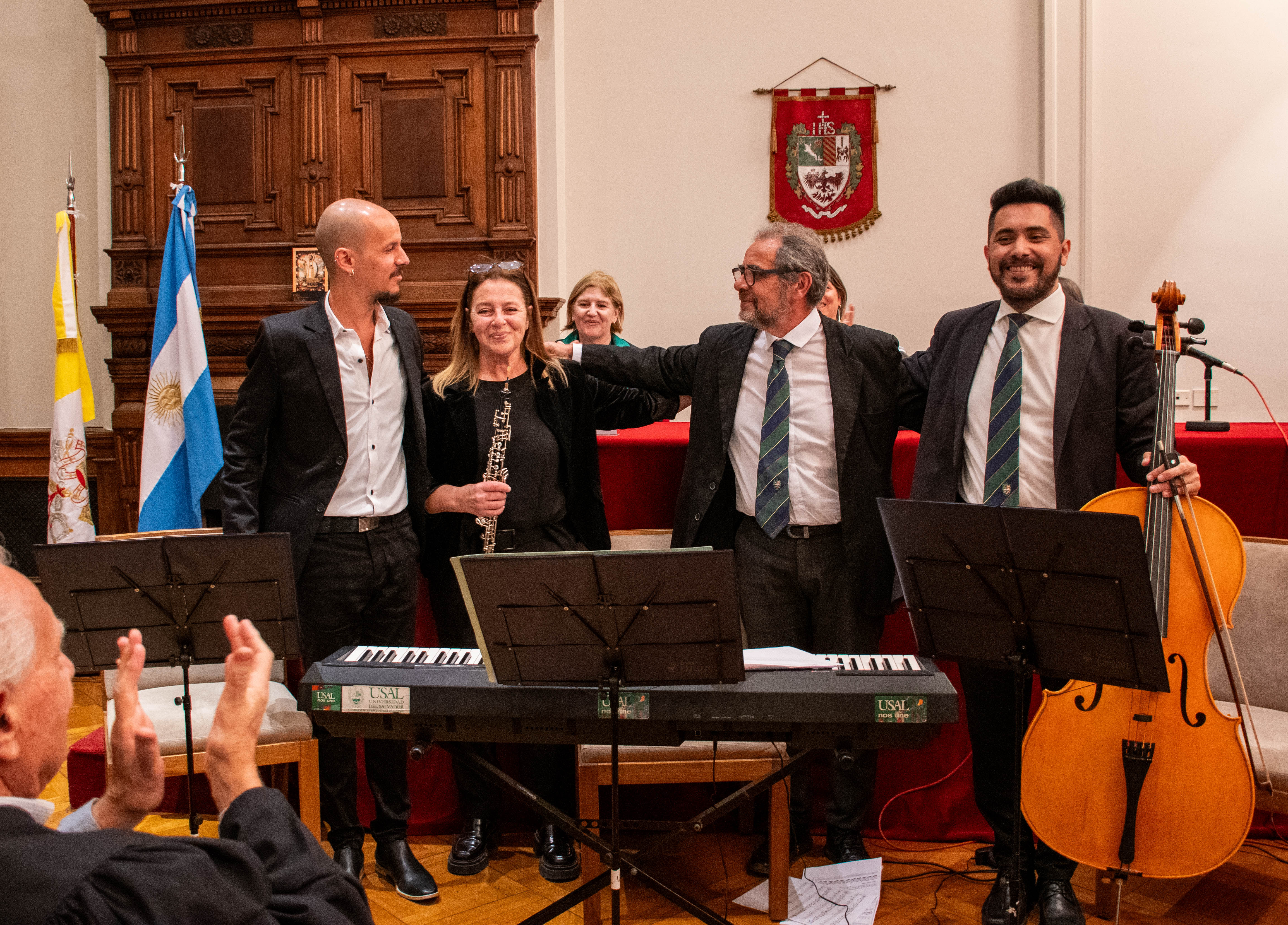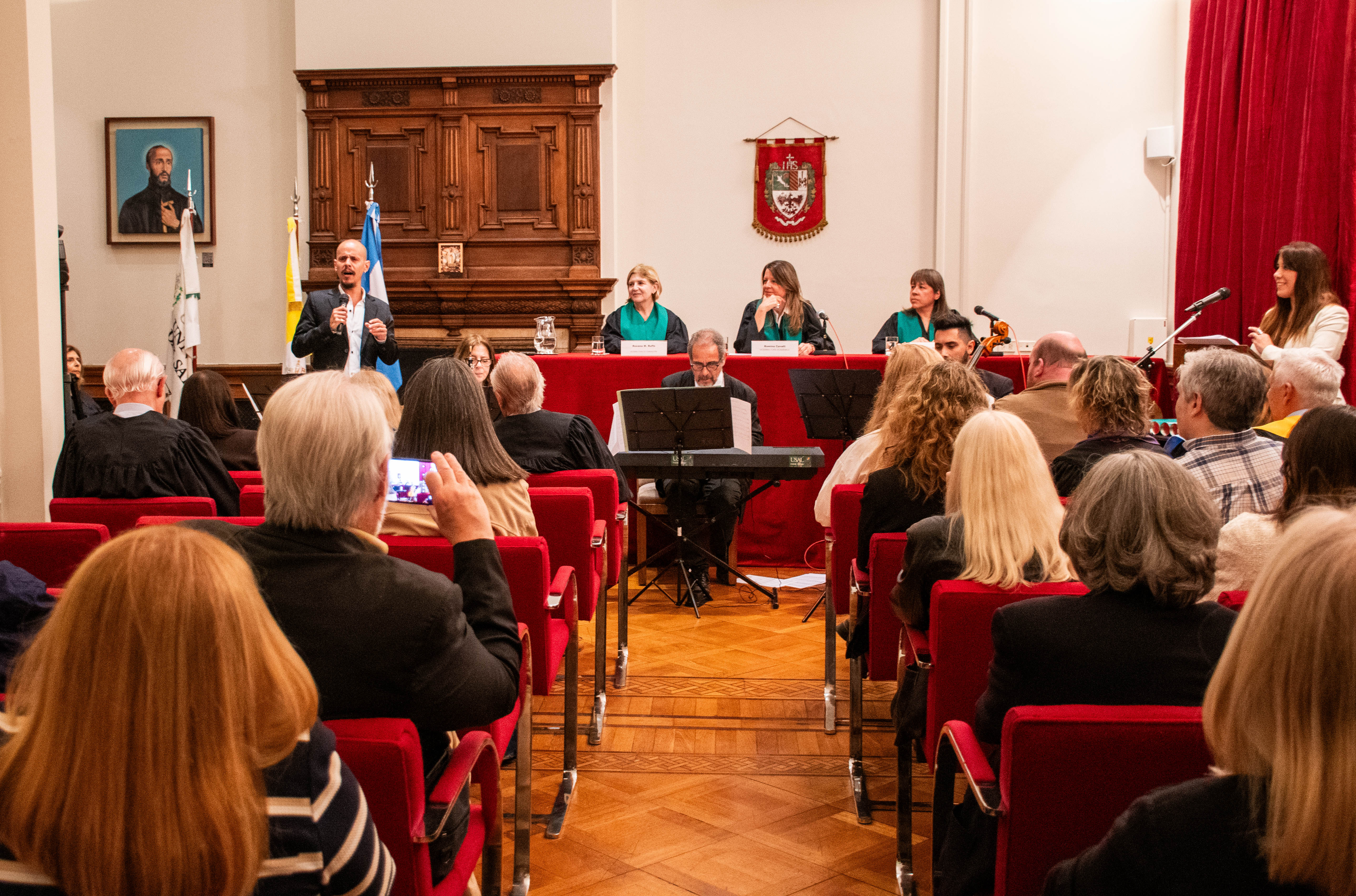 La celebración continuó con la presentación del Dúo de Cuerdas de la Orquesta Sinfónica de la Universidad del Salvador (USAL), integrado por profesores y alumnos de la Comunidad Académica, quienes interpretaron varias melodías en este importante encuentro. A continuación, el Padre Andrés Tocalini procedió a la bendición de los diplomas y medallas.