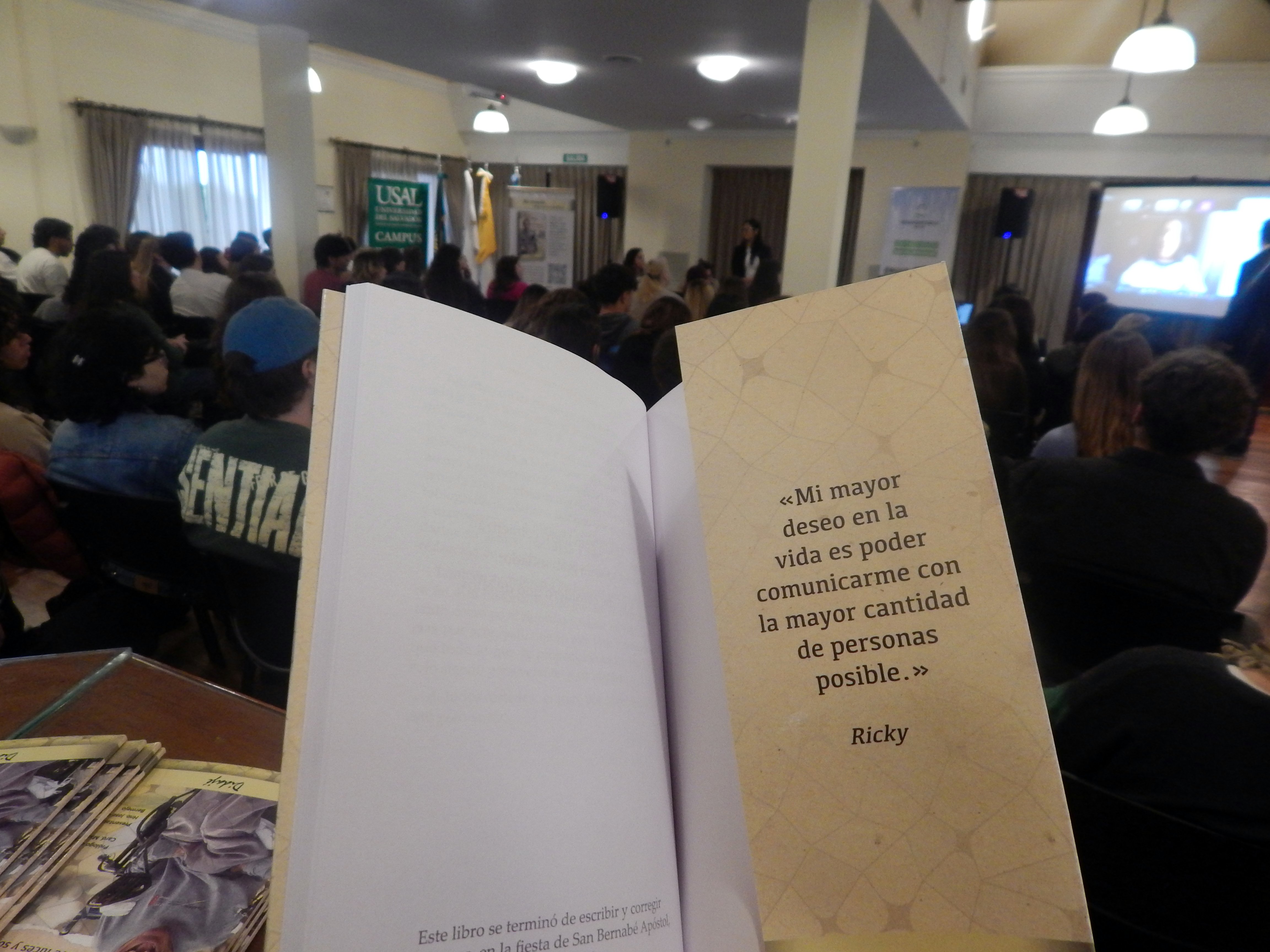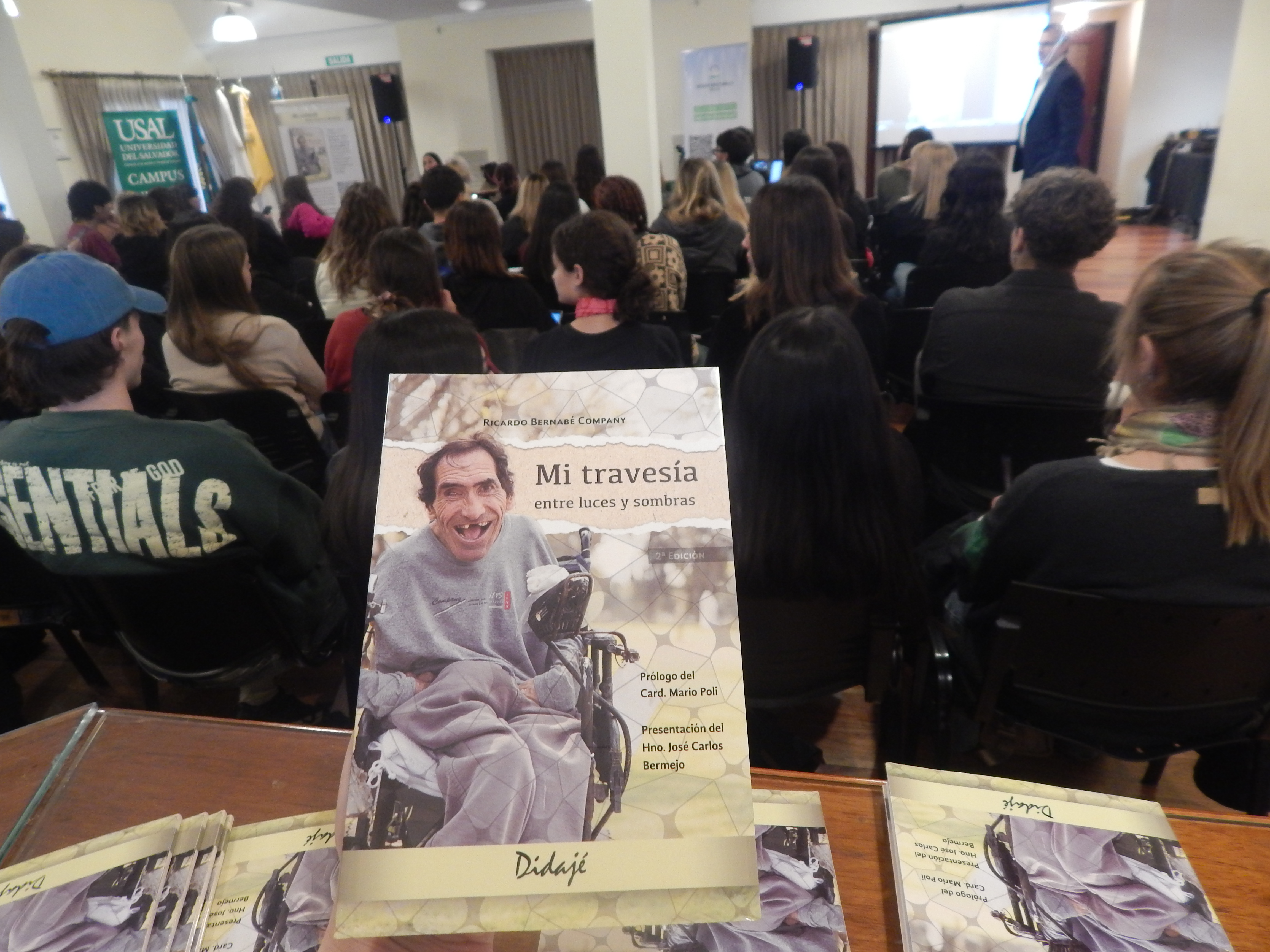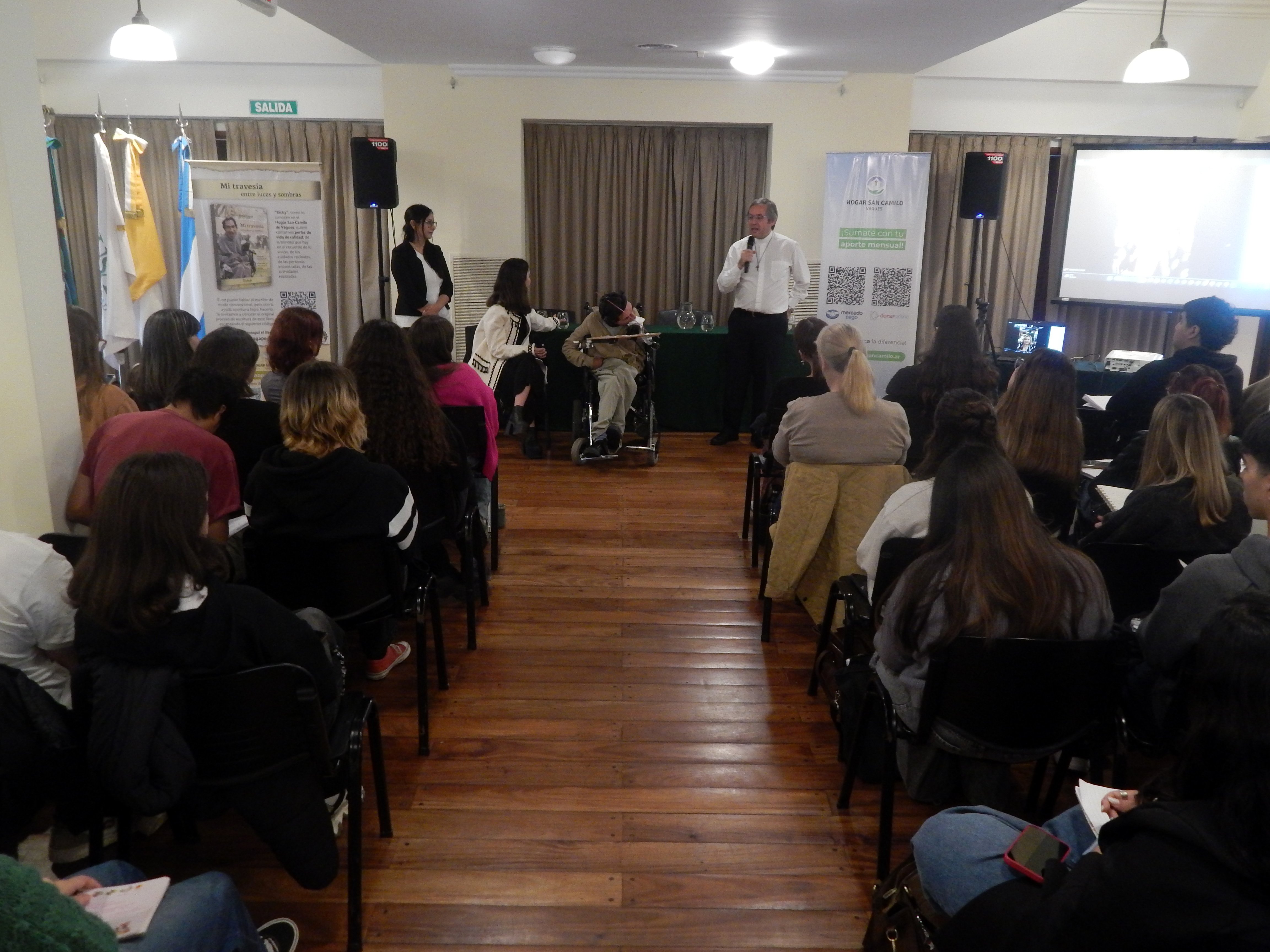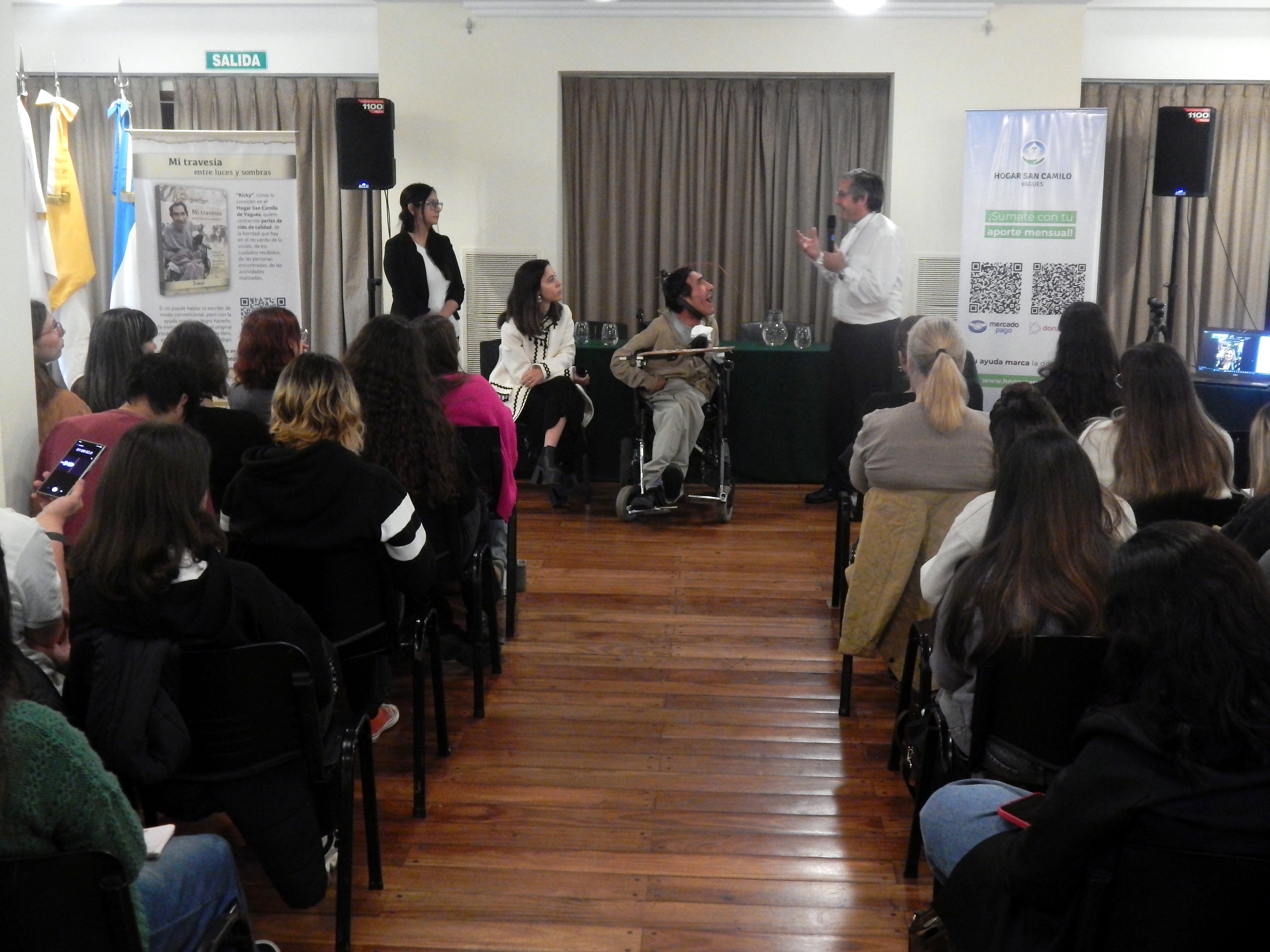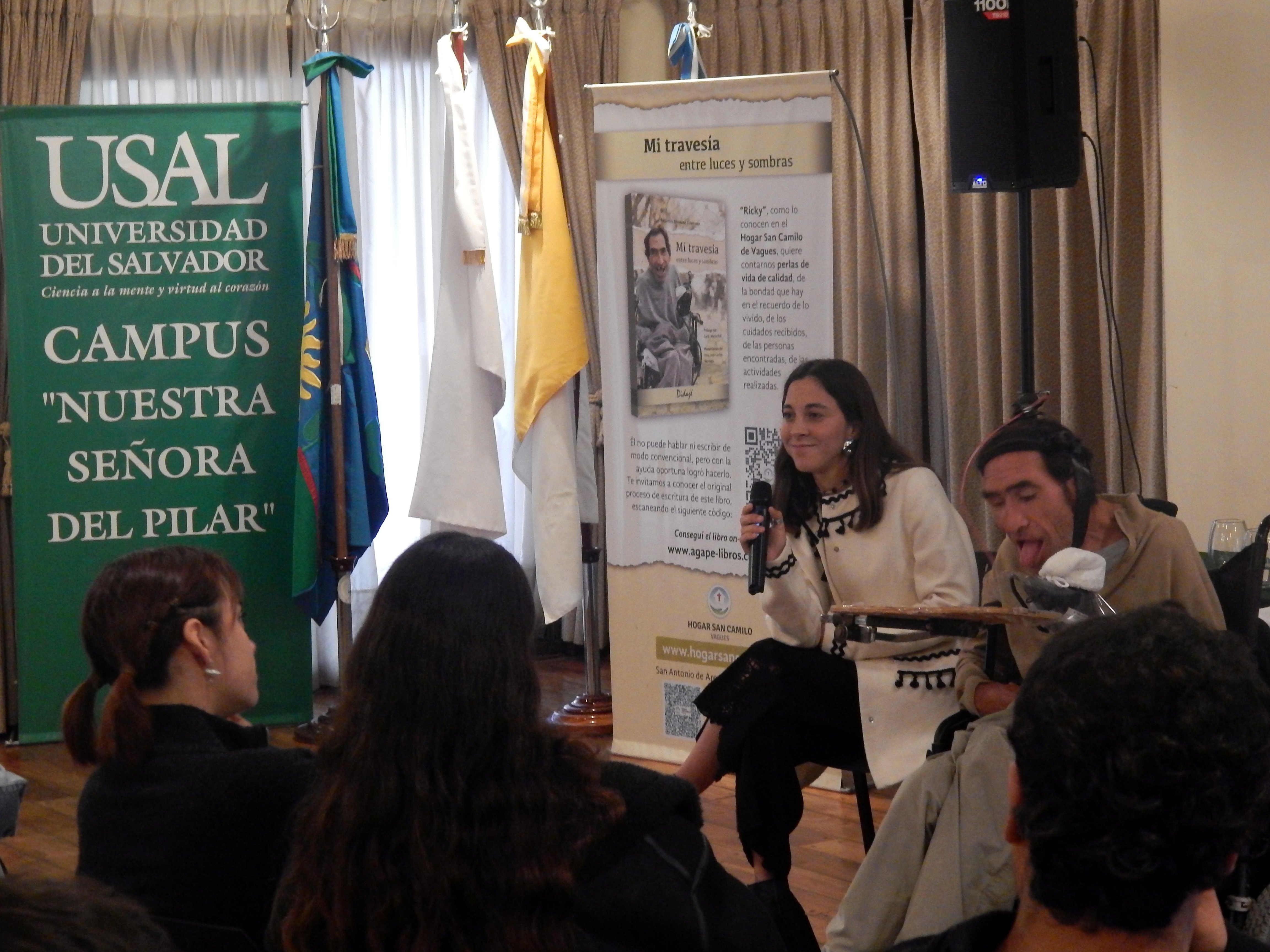 Durante la jornada, Ricardo Bernabé, autor con discapacidad múltiple, junto a su terapeuta Lic. Melina del Castillo (egresada de la USAL) y el Pbro. Francisco Bértola, compartieron el proceso de creación del libro “Mi travesía: luces y sombras”, elaborado en el marco institucional del Hogar San Camilo.