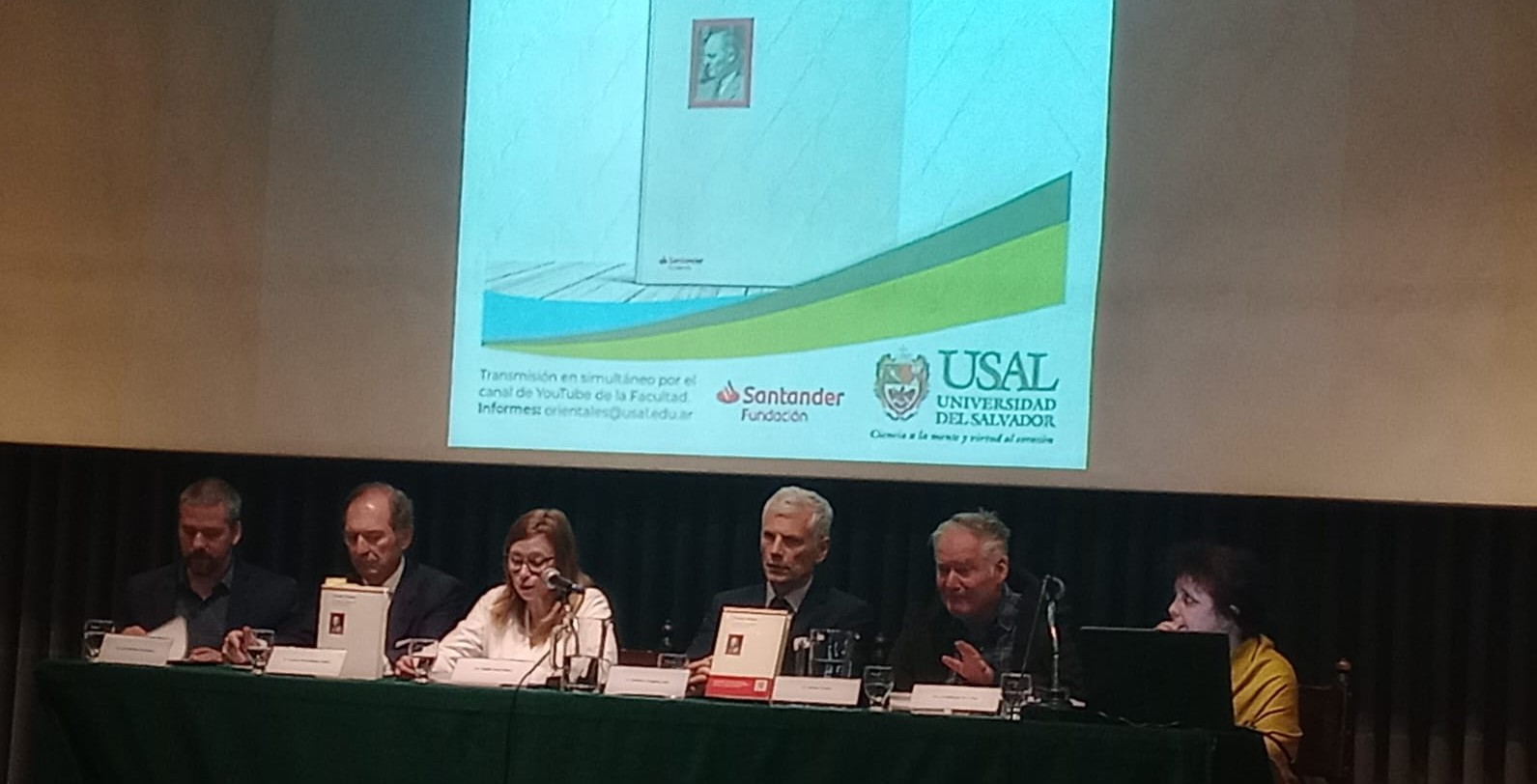 Acompañaron la actividad, Francisco Borja Baselga Canthal, Director General de la Fundación Santander España y Guillermo Tempesta Leeds, Presidente del Banco Santander y de la Fundación en Argentina, cuya presencia puso de relieve el compromiso de la institución con la recuperación y difusión de autores fundamentales en lengua española. También estuvieron presentes la Vicerrectora Académica, Romina Cavalli, y Soledad Herrera, Directora de Publicaciones Científicas de la USAL, en representación de la Vicerrectora de Investigación y Desarrollo, Luciana Tondello, y Elena Tavelli, Directora Artística de la Fundación Santander Argentina. La coordinación estuvo a cargo de la Decana, Claudia Pelossi y del Director de la Escuela de Estudios Orientales, Juan Bautista García Bazán, mientras que las exposiciones principales fueron ofrecidas por Lía Rodríguez de la Vega y Esteban Ierardo.