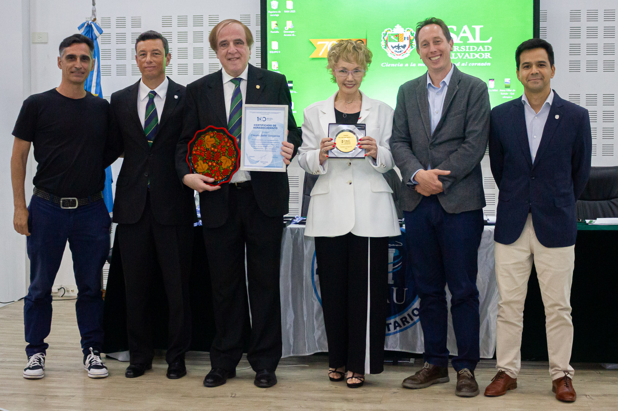 Además, la USAL destacó la colaboración internacional con la presencia de Dina Oyun, Directora de la Casa de la Ciencia y la Cultura de Rusia, quien intercambió recuerdos con Claudio Gonçalves.