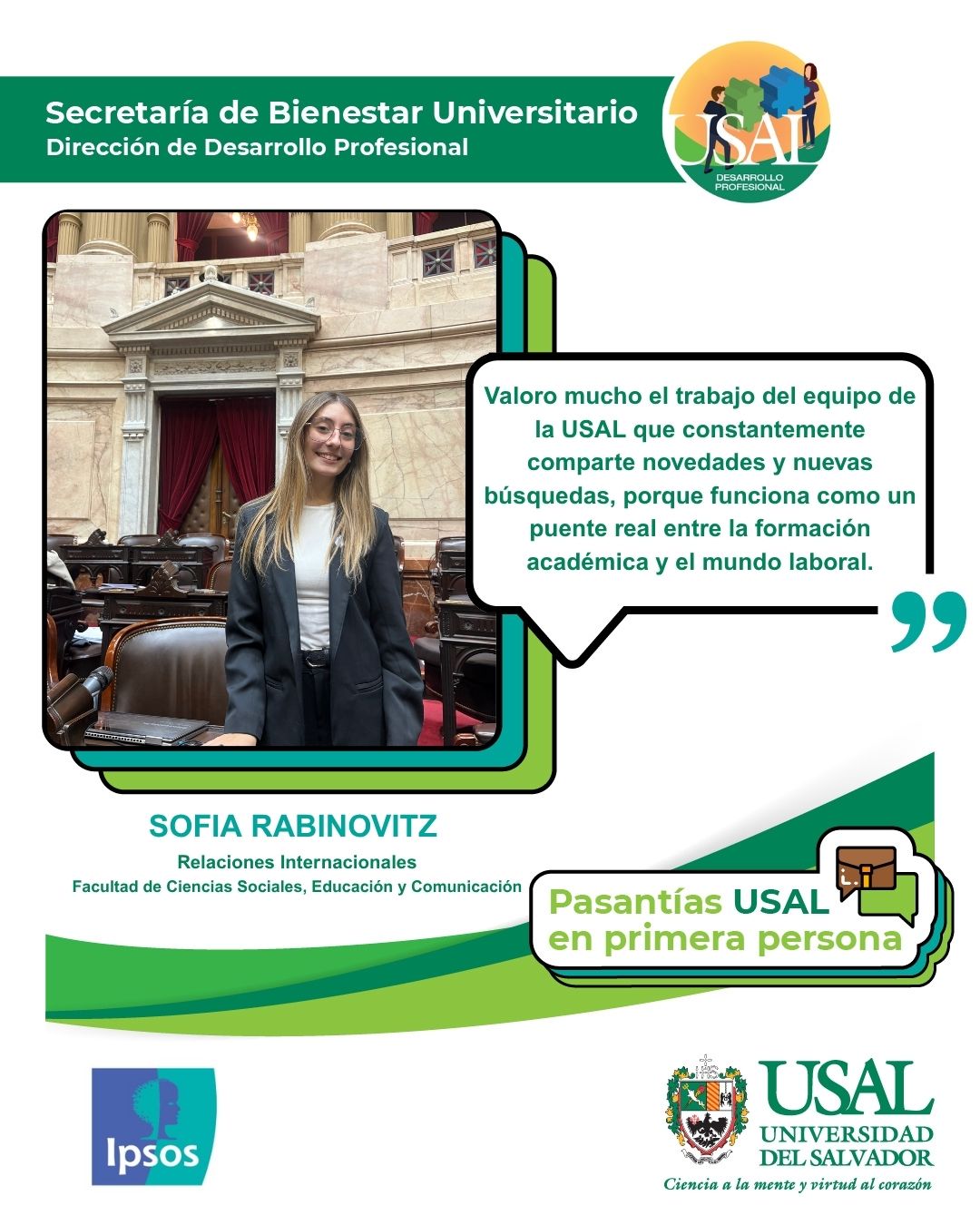 En esta oportunidad, Sofía Rabinovitz, estudiante de la Licenciatura en Relaciones Internacionales, comparte su experiencia como pasante en la consultora Ipsos, donde dio sus primeros pasos en el mundo corporativo.