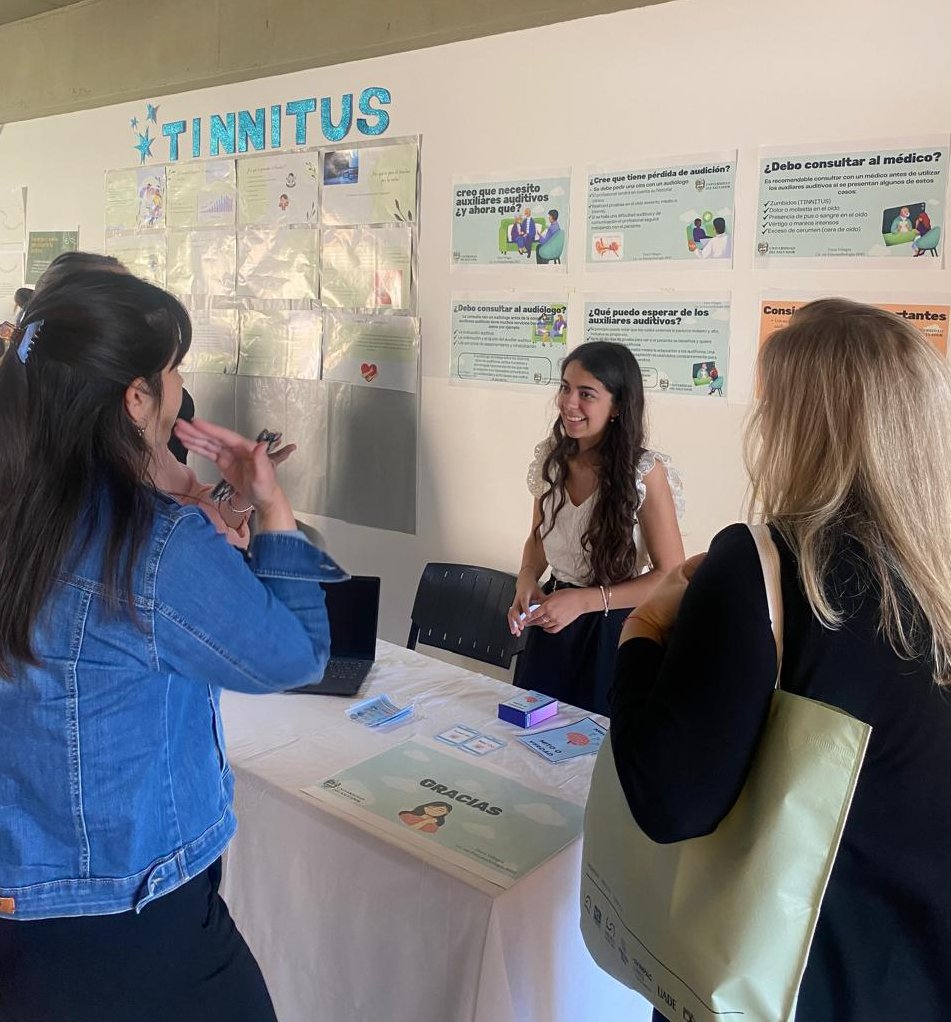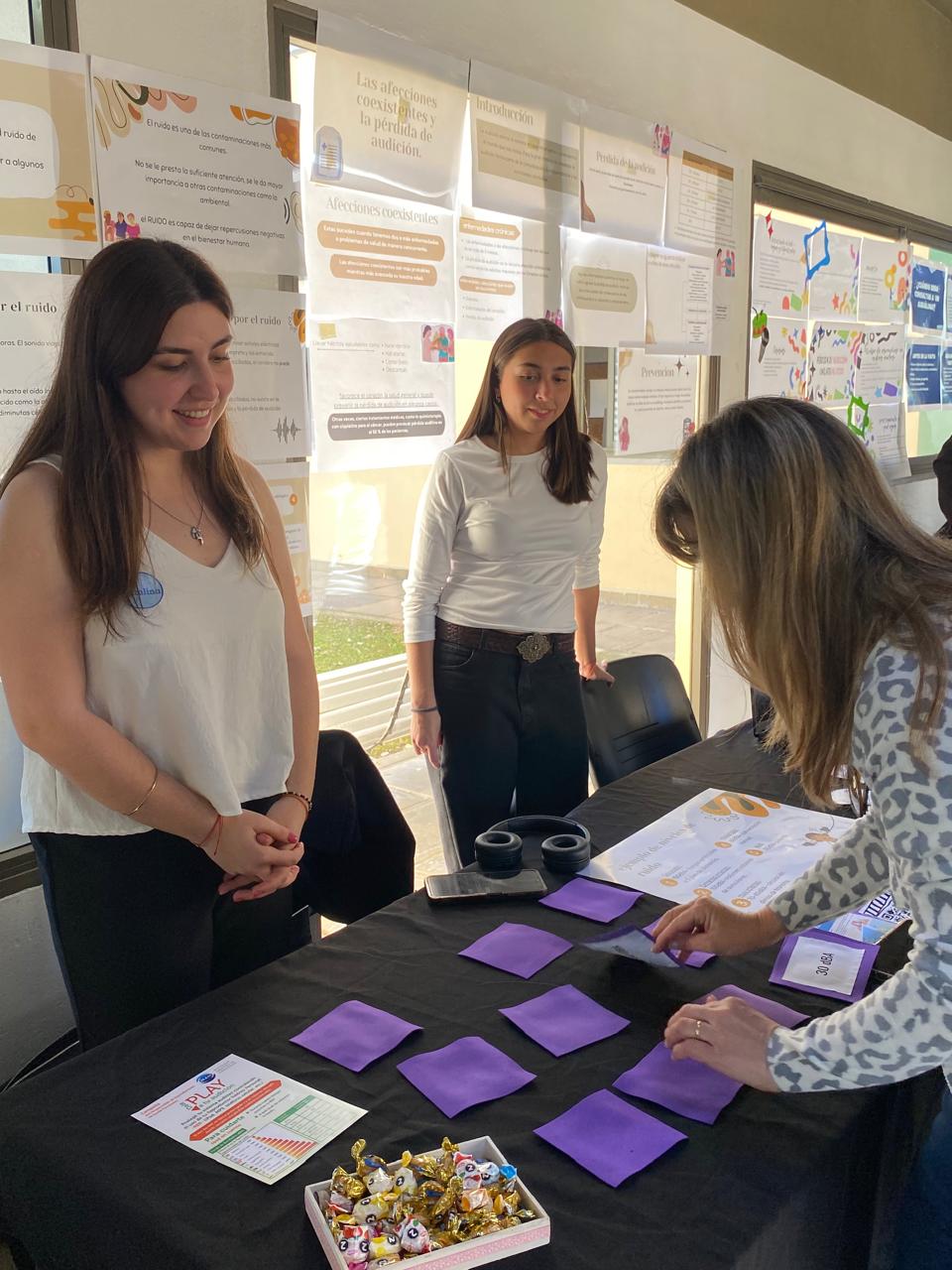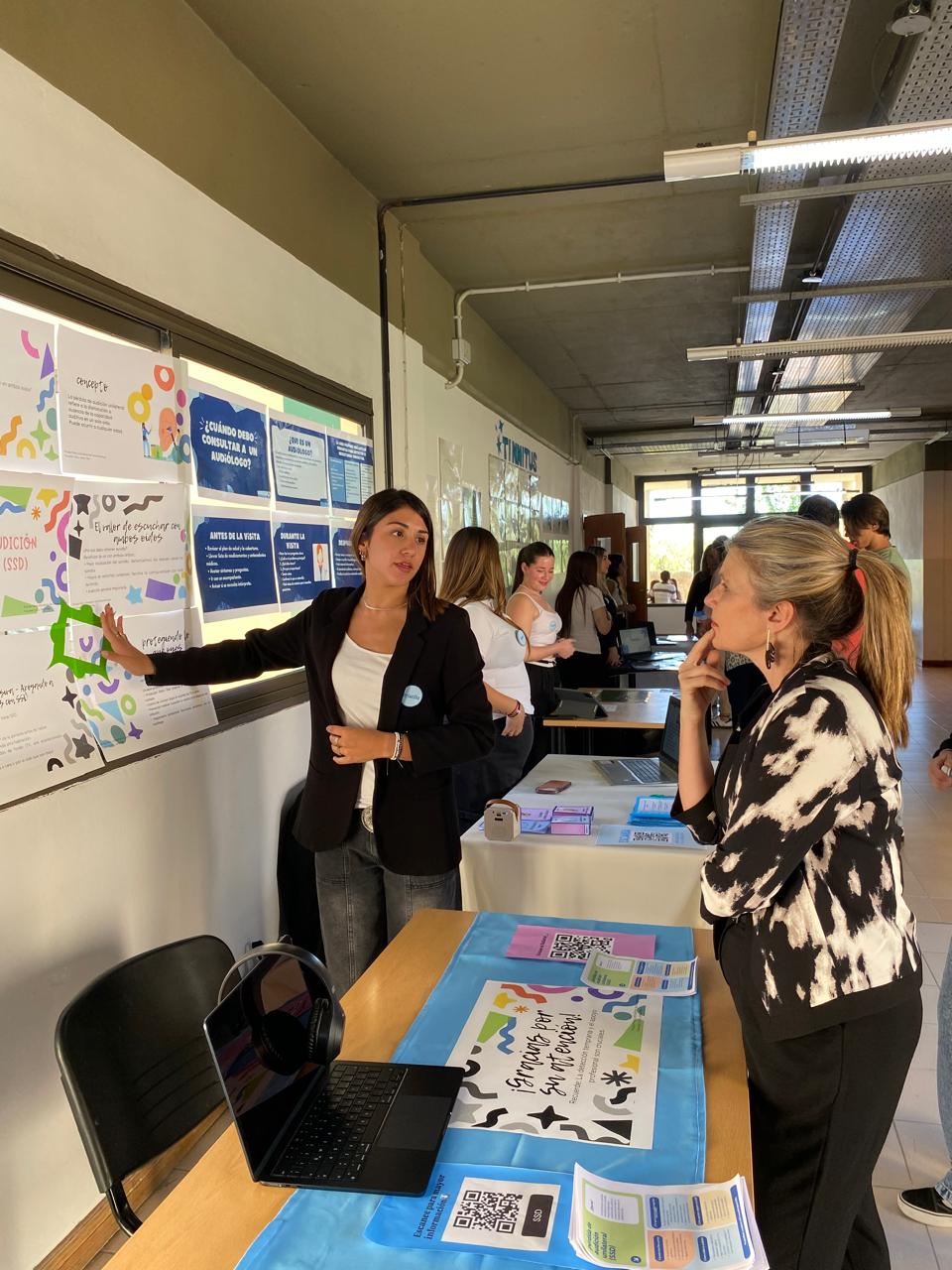 Con la presencia de la Directora de Fonoaudiología en la sede Pilar de la USAL, Mg. Bettina Schettini, quien impulsa este tipo de actividades que integran la teoría con una práctica formativa reflexiva, y la guía de la Profesora De Lellis, las estudiantes de primer año de la Carrera presentaron stands interactivos que invitaron a la Comunidad USAL a tomar conciencia de que “Cuidar la audición es cuidar el vínculo con los demás."