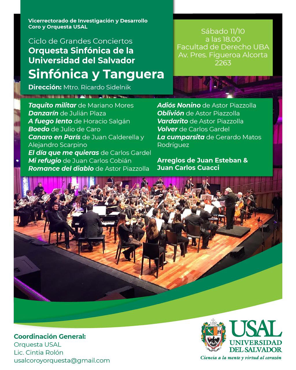 En el marco del Ciclo de Grandes Conciertos en la Facultad de Derecho (UBA), la Orquesta Sinfónica de la Universidad del Salvador (USAL) celebra su 25 Aniversario con una velada imperdible presentando “Sinfónica y Tanguera”, en Av. Pres. Figueroa Alcorta 2263, CABA.