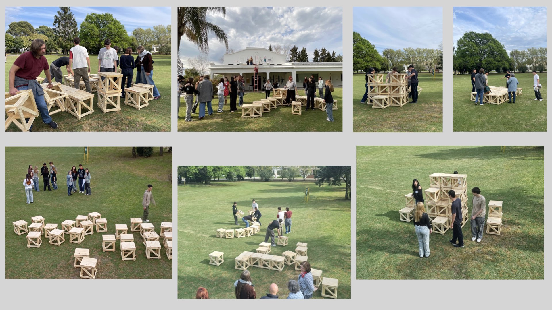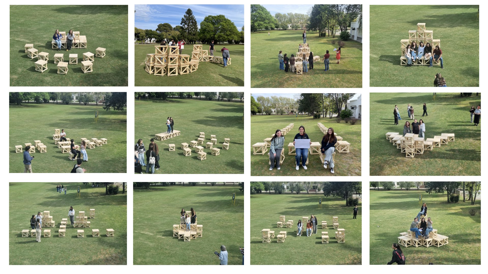 El último día de la jornada tuvo un cierre especial, todos los practicables fueron organizados por los equipos sobre el césped del Campus, en un montaje colectivo iluminado por el sol de la tarde. Cada grupo presentó su propuesta mientras los demás alentaban como espectadores, en un ambiente de celebración compartida. La actividad concluyó con el registro fotográfico de los resultados, que documentó no solo los productos construidos, sino también la energía, la cooperación y el entusiasmo que marcaron la experiencia.