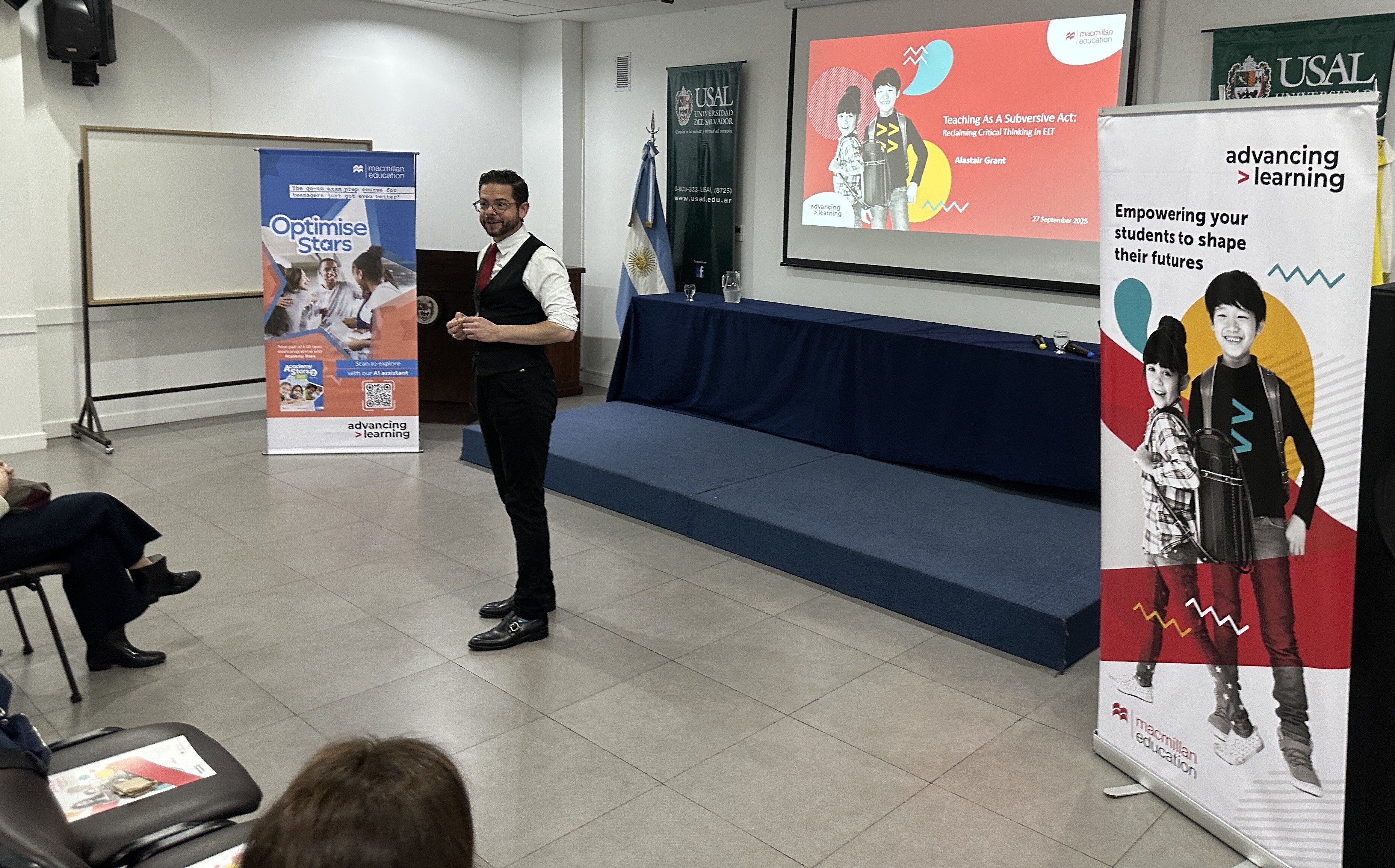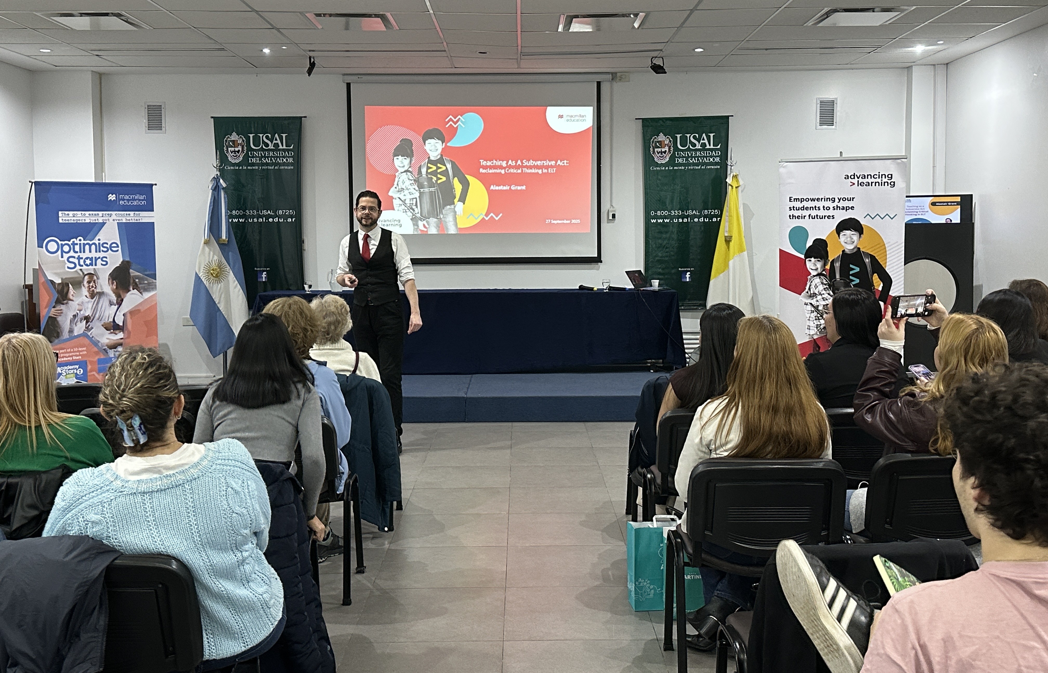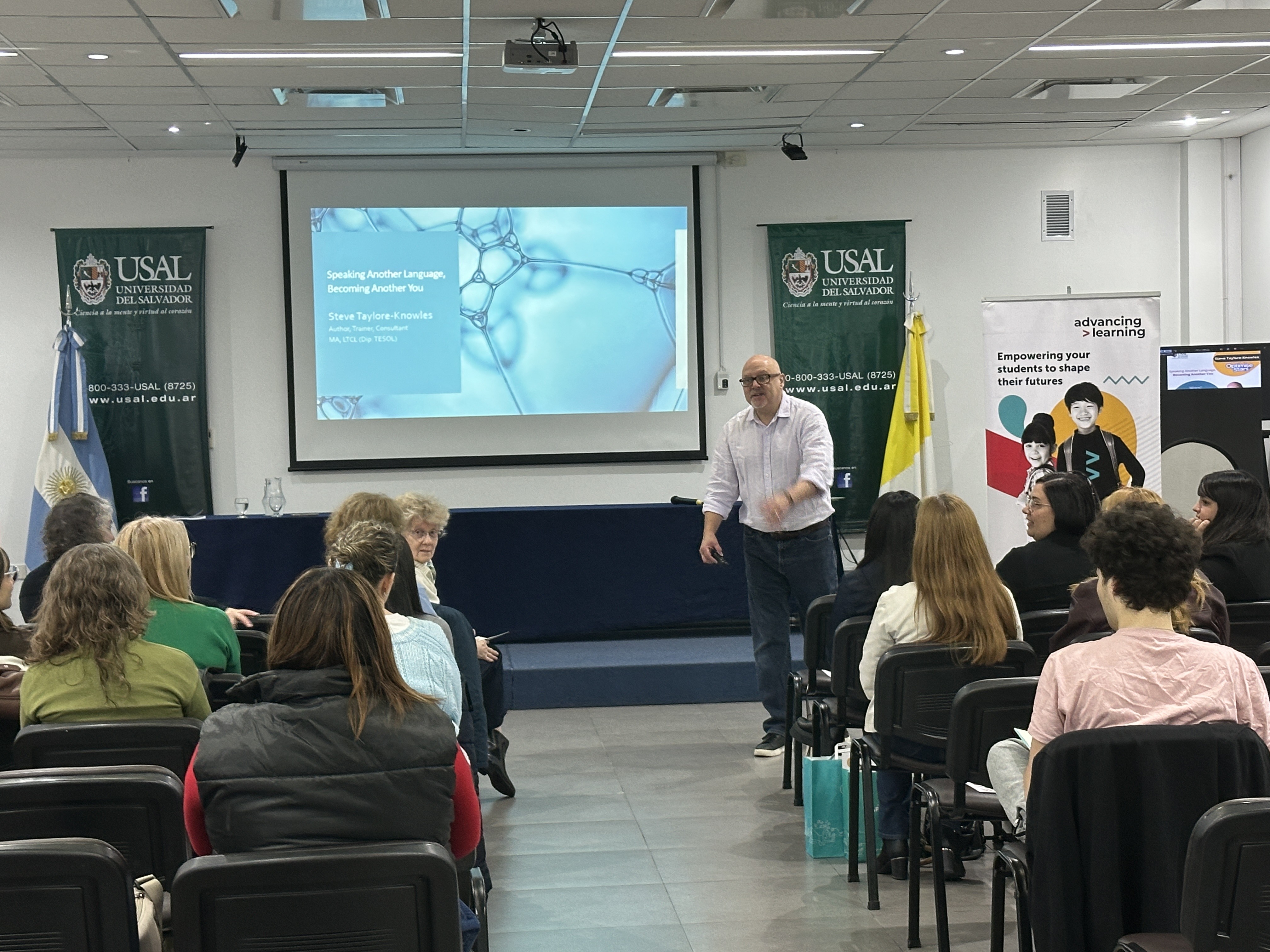 El sábado 27 de septiembre Steve Taylore-Knowles, autor inglés de la serie Optimise Stars de Macmillan Education y experto en exámenes internacionales, presentó su charla «Speaking Another Language, Becoming Another You», en la jornada para profesores de inglés, organizada por Macmillan Education Argentina, en la Escuela de Lenguas Modernas de la Universidad del Salvador (USAL). El prof. Taylore-Knowles ya había visitado la USAL en septiembre de 2017, oportunidad en la que se refirió a las habilidades que permiten a los alumnos enfrentar desafíos con flexibilidad, adaptabilidad y confianza en sí mismos, y adecuarse más a los perfiles laborales que van de la mano del desarrollo de sus competencias en el idioma.